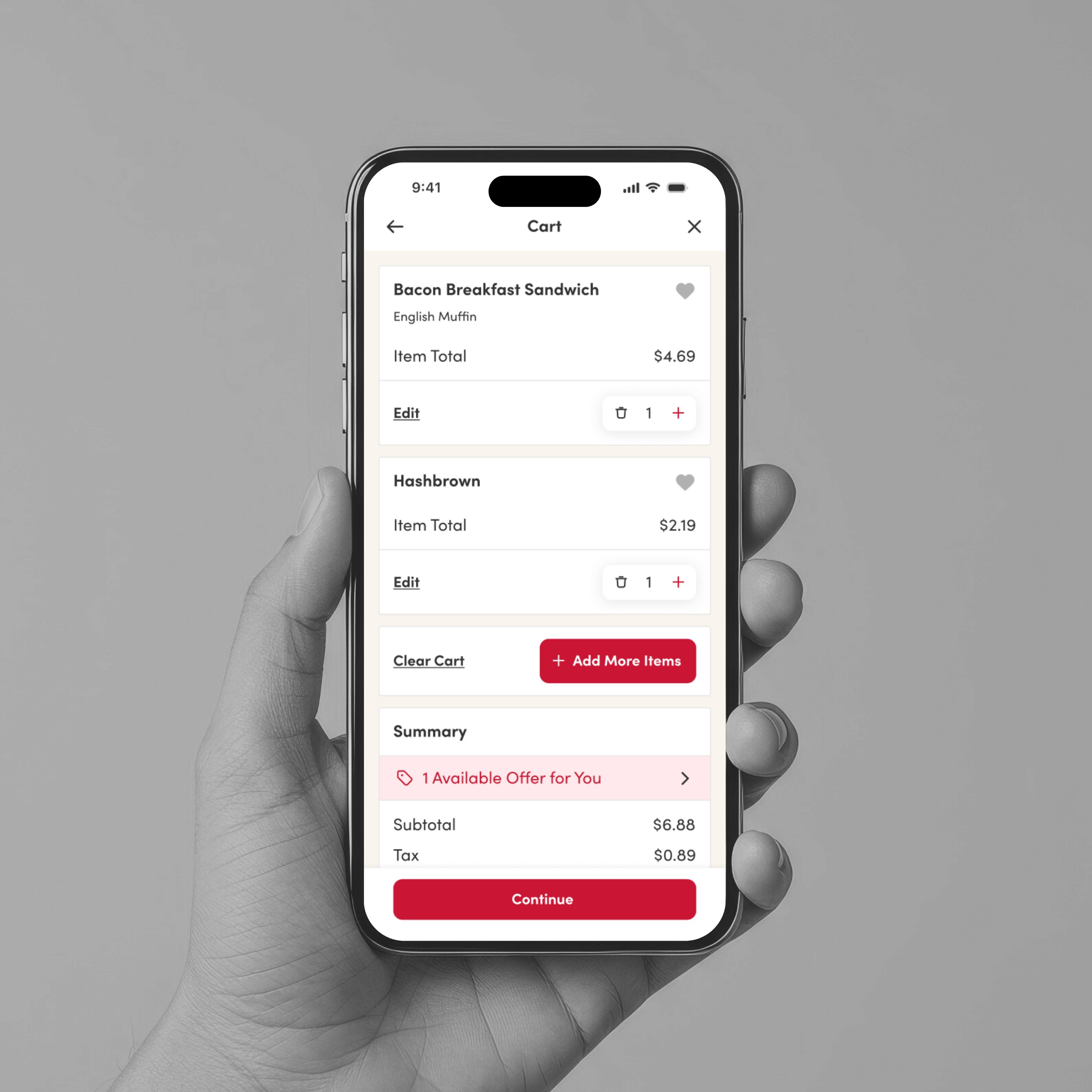 We encountered two main constraints: a limited timeframe and a defined project scope. To tackle these challenges, we prioritized the product’s scale and made iterative adjustments based on usability testing. The typical purchasing process involves browsing and selecting items from the menu; however, we opted to skip this step and focus on the “happy path” in our design to streamline the experience. Our testing prototype begins with two items already in the cart, and we instructed participants to review and add offers during the checkout process.