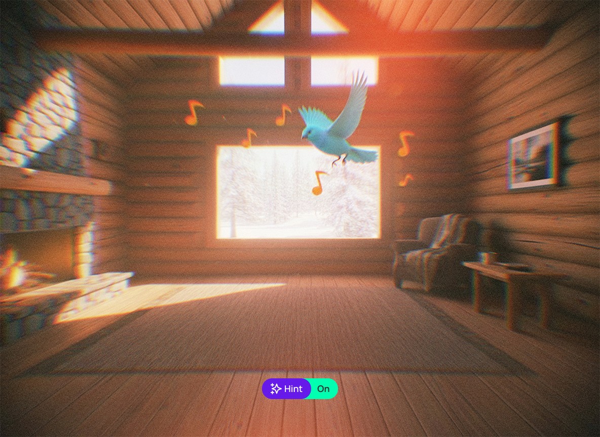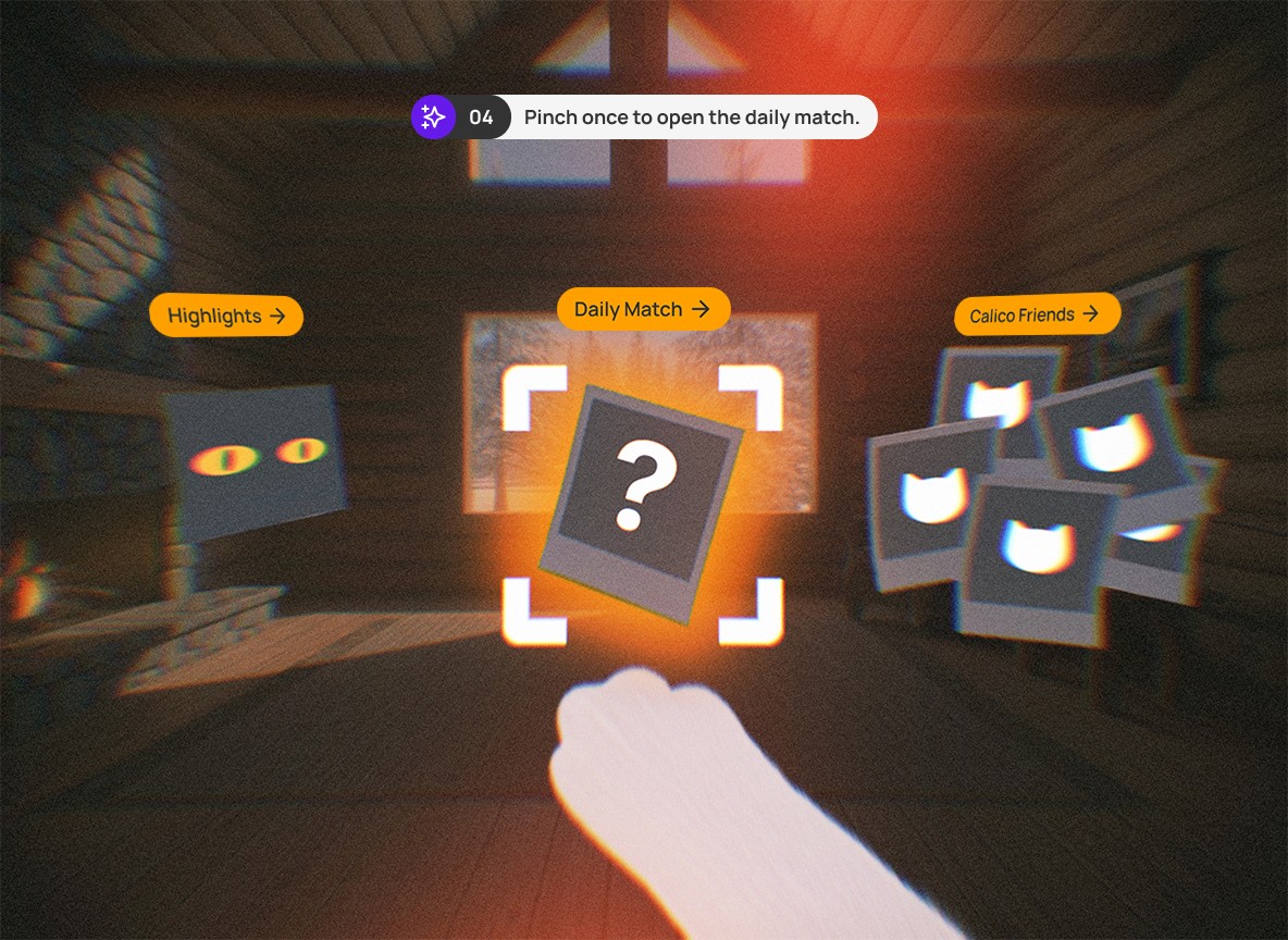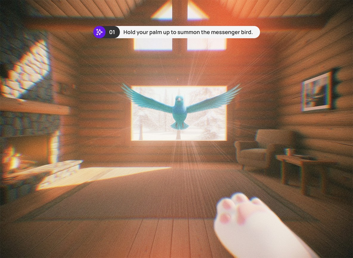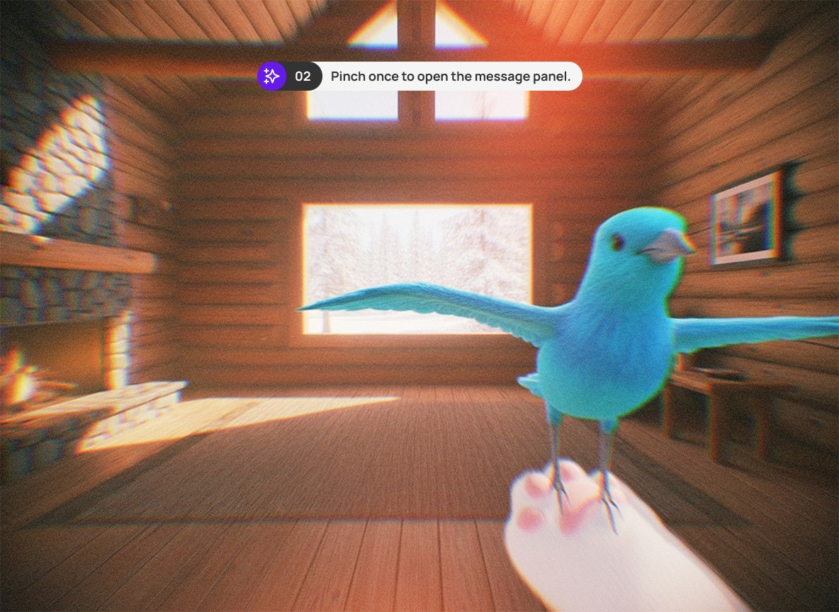A messenger bird flies through the environment to deliver notifications and daily matches. Users summon it with a palm-up gesture to review messages—an ambient notification system that preserves immersion without interruptions.