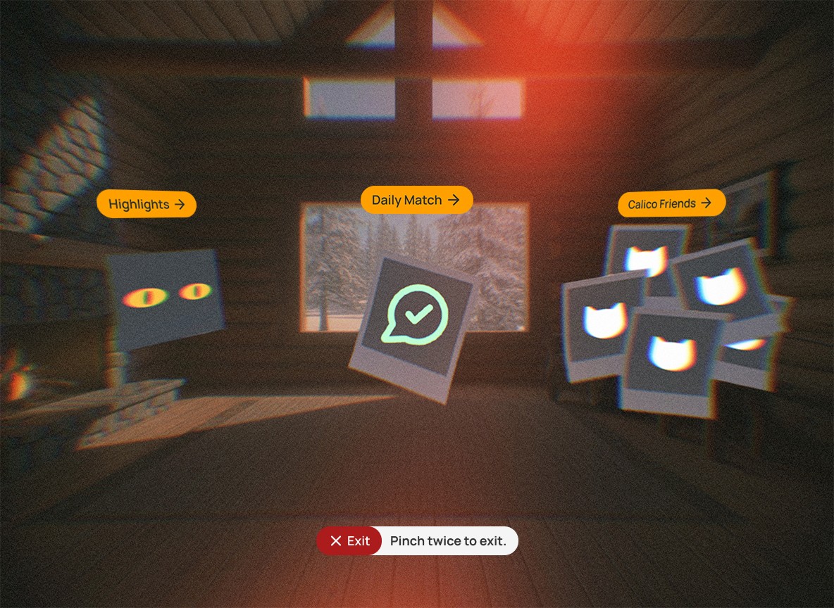 Calico Us is a fully immersive VR social platform that reimagines interaction beyond stereotypes. Users embody calico cat avatars and meet one new friend each day through meaningful, patient-paced connections. The notifications and daily match delivered by a messenger bird enable unique XR interactions that transcend conventional verbal and text-based communication.