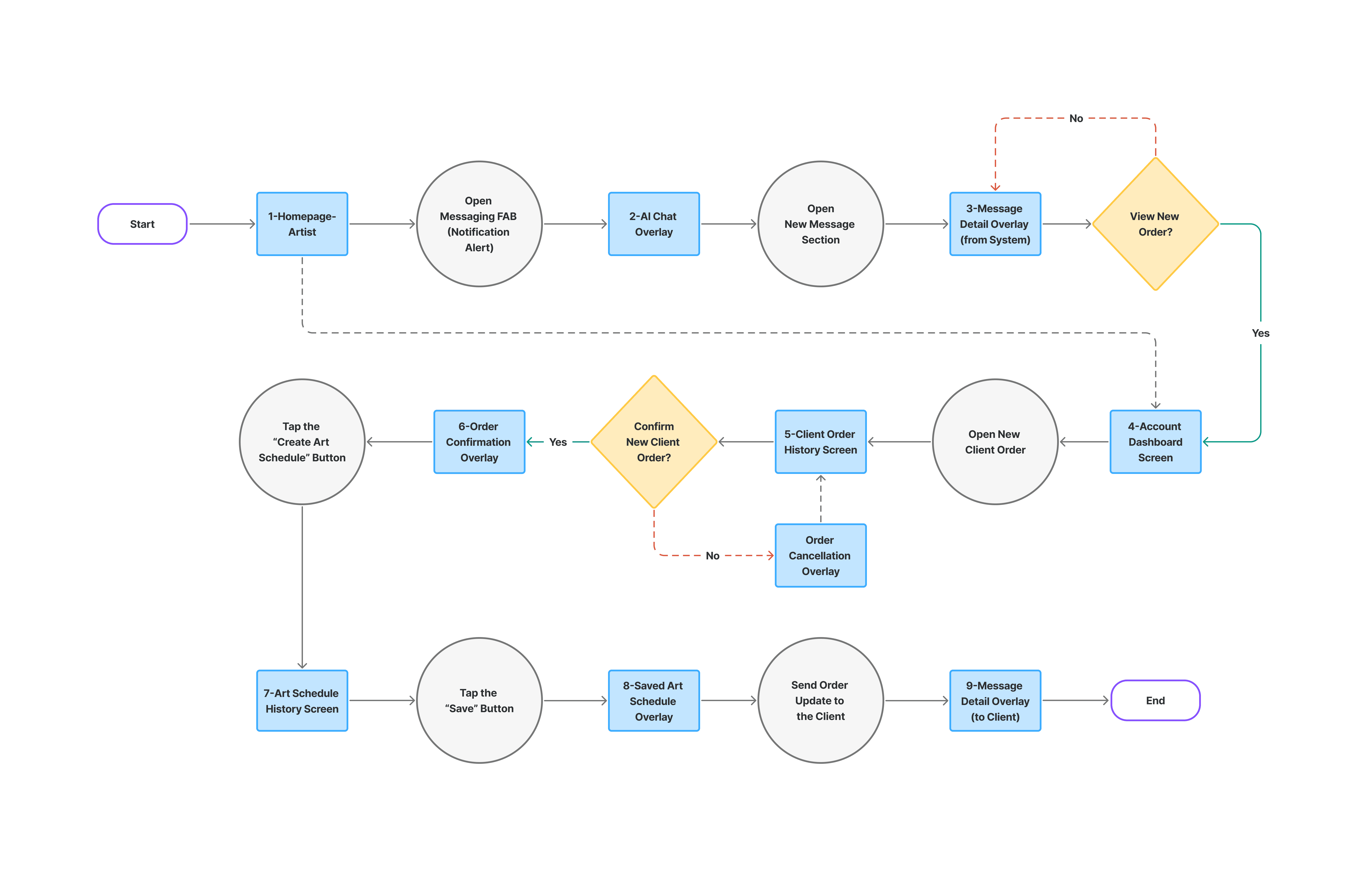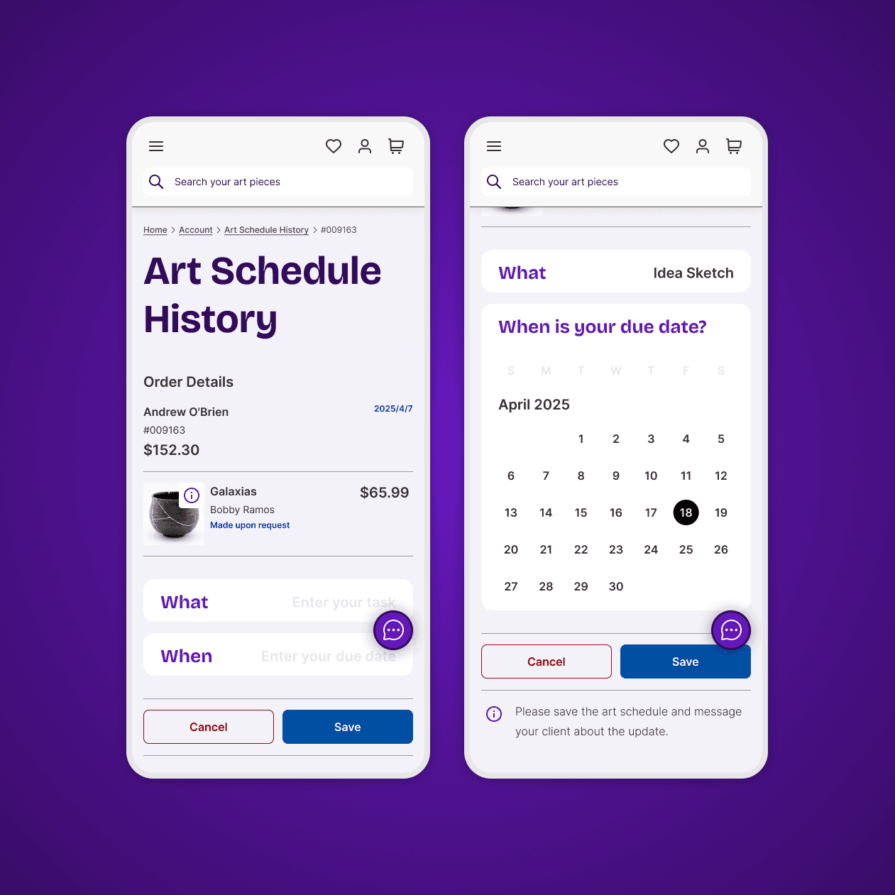 We built an AI chatbot that helps artist and client stay aligned throughout the commission process. Prompt cards guide key actions. All custom details sync in one place.