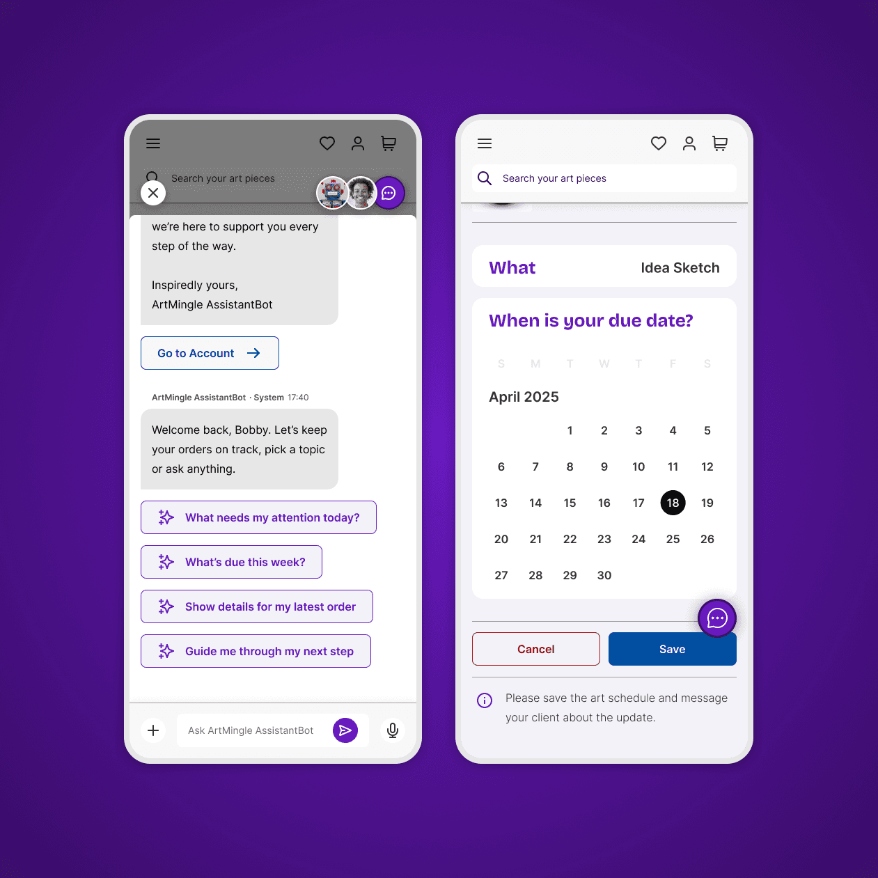 We built an AI assistant that sits across the artist’s workflow, helping both artist and client stay aligned throughout the commission process. Prompt cards guide key actions. All custom details sync in one place.