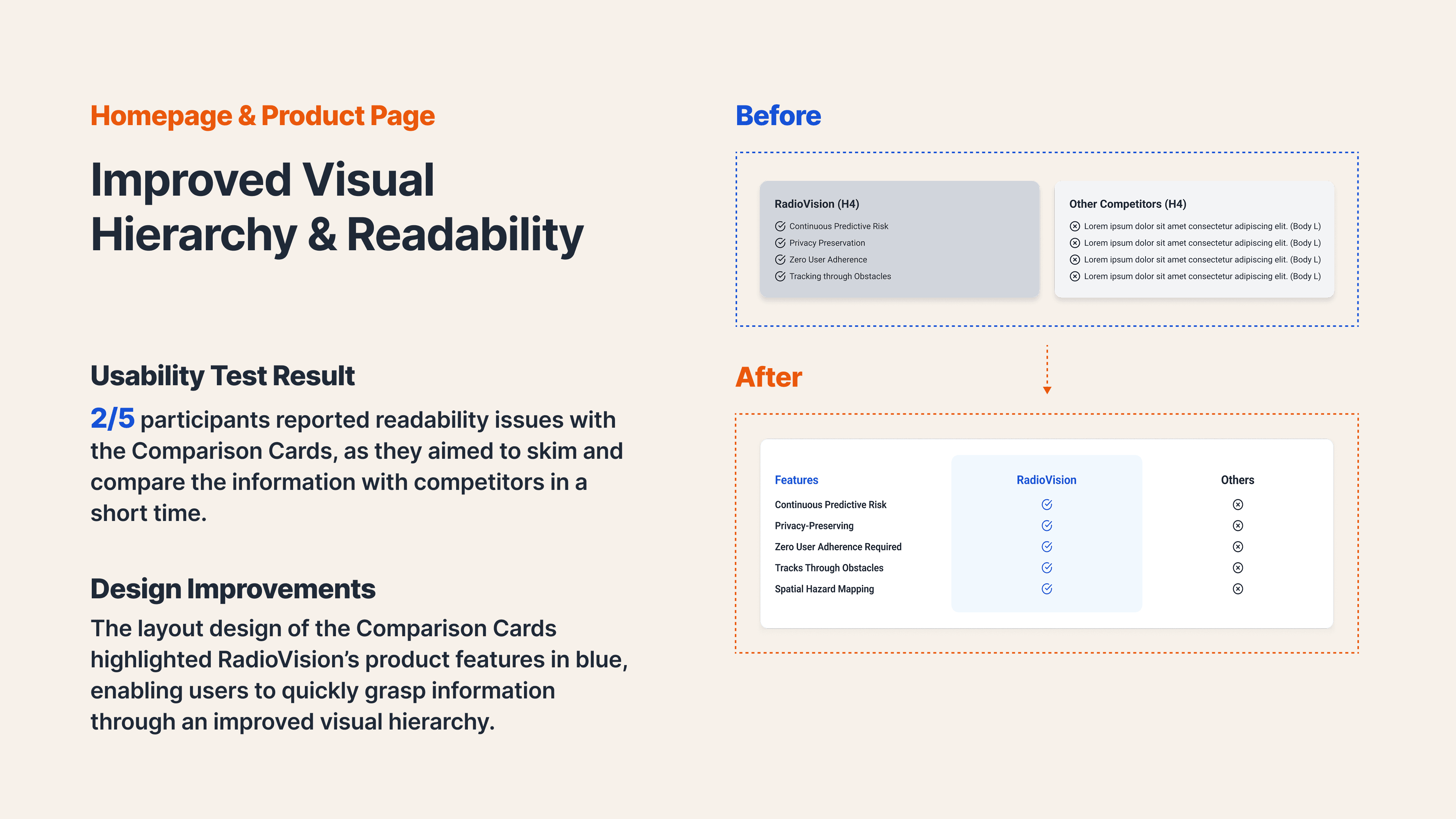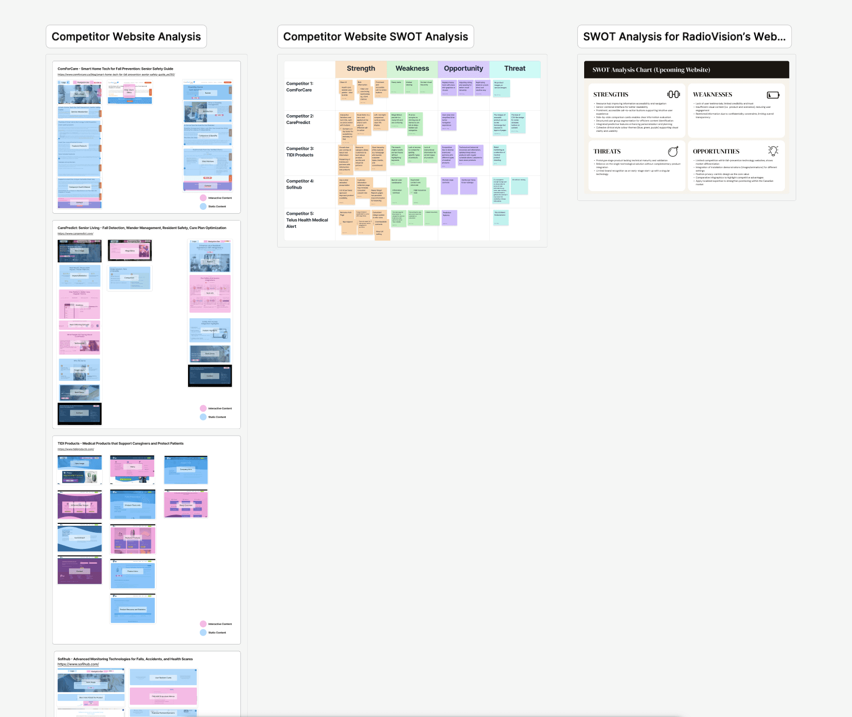Analyzing the websites of five competitors in the healthcare industry provided design patterns and references, supporting the SWOT analysis and complementing survey insights on what and how to express concepts through UX design.