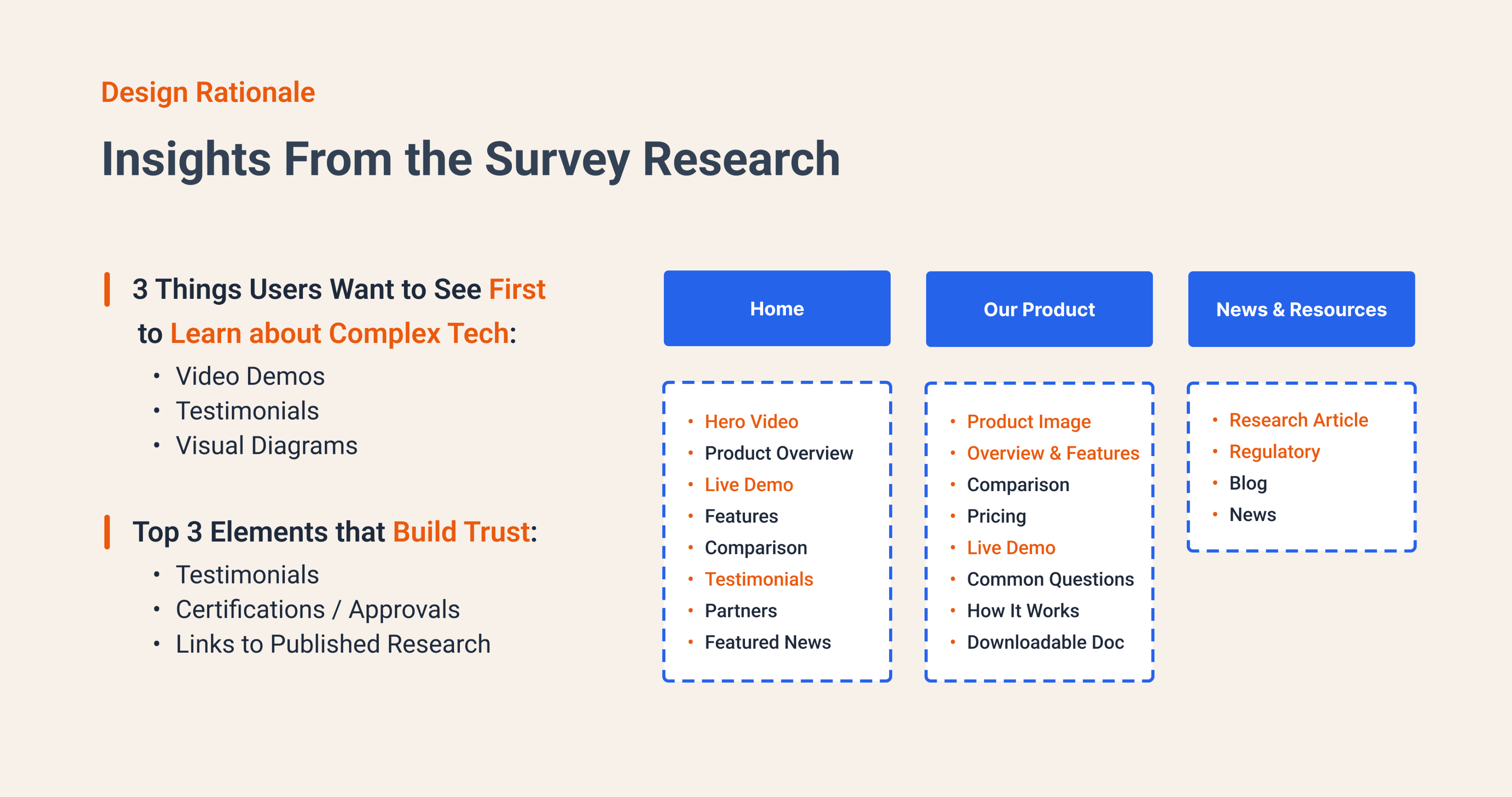 I applied my UX research skills to analyze survey responses and visualize insights, revealing users’ expectations for the healthcare web and the tech that informed the information architecture and wireframe v1.