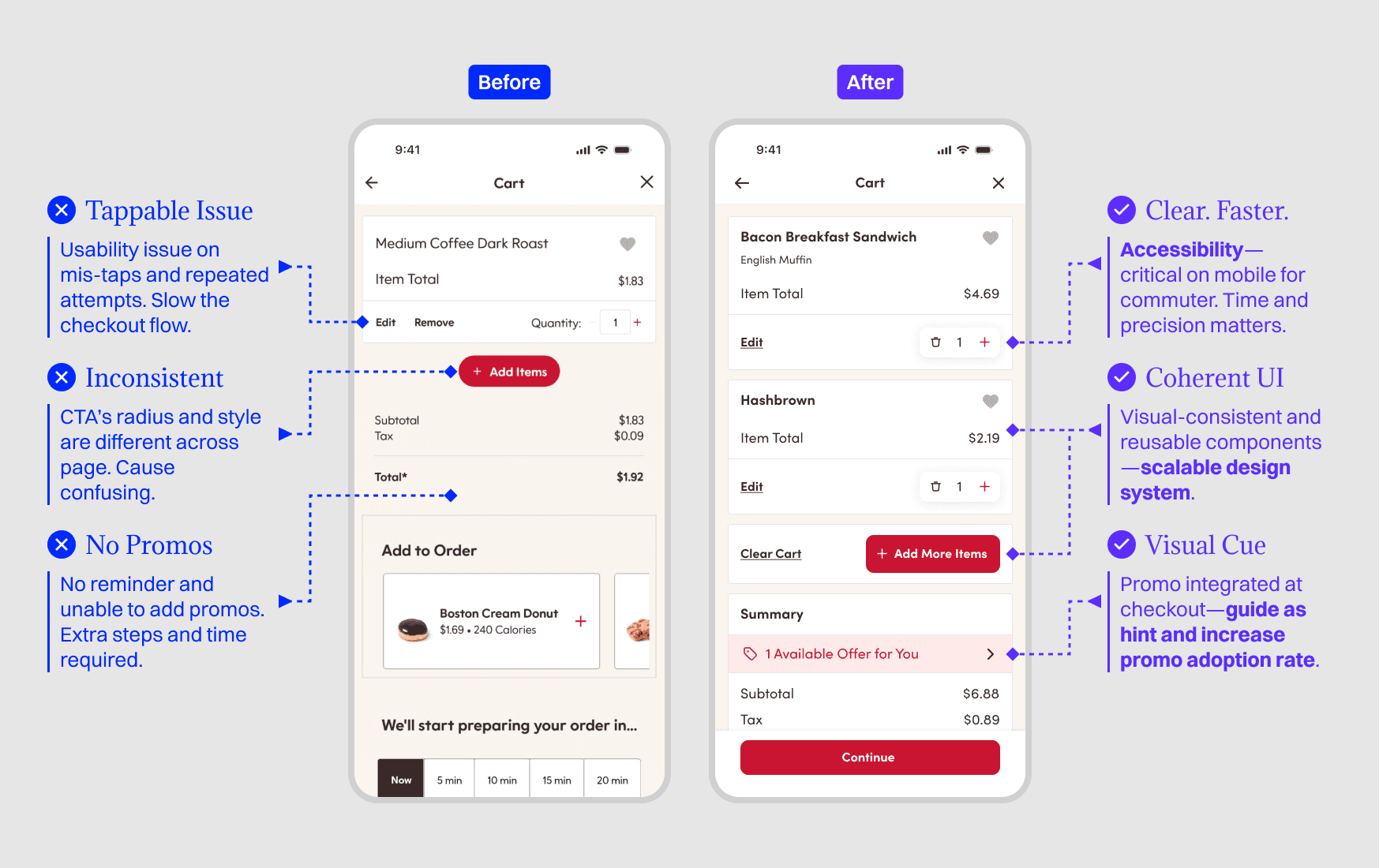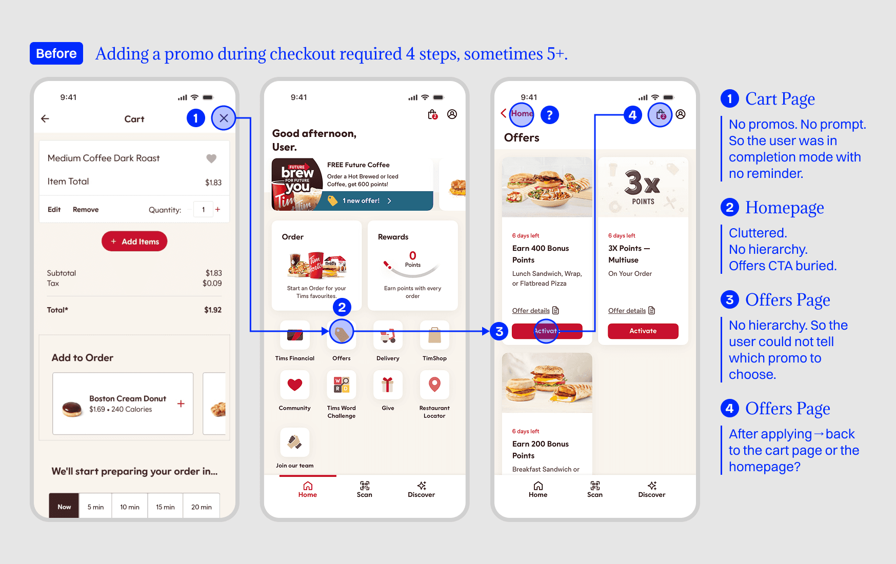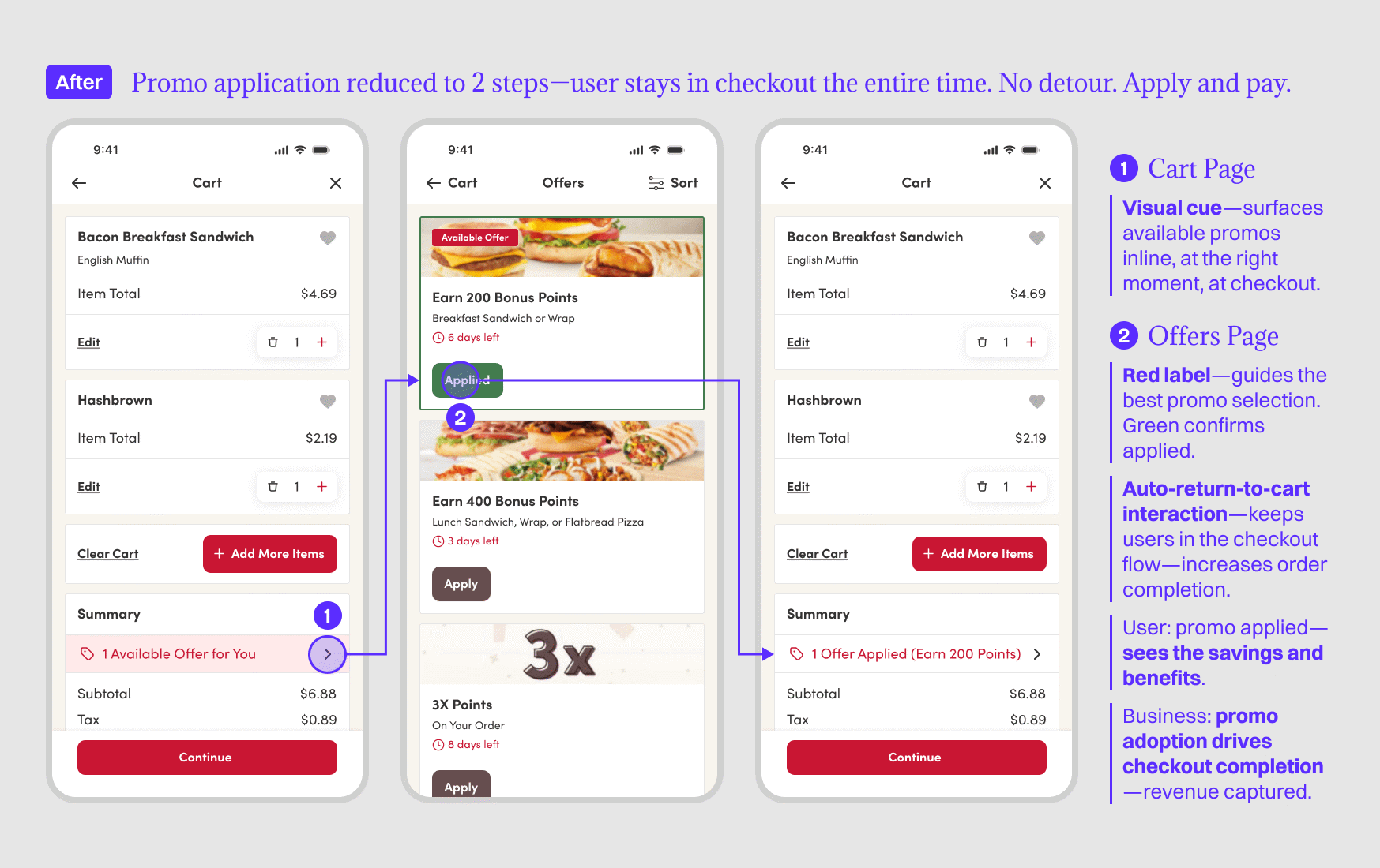 Promos lived on the homepage. Checkout lived on the cart page. They’d never been connected. To apply a promo, users had to leave the cart, navigate back, find the promo, apply it, and return to the cart. With 4 or 5+ taps required. While their ride was arriving.